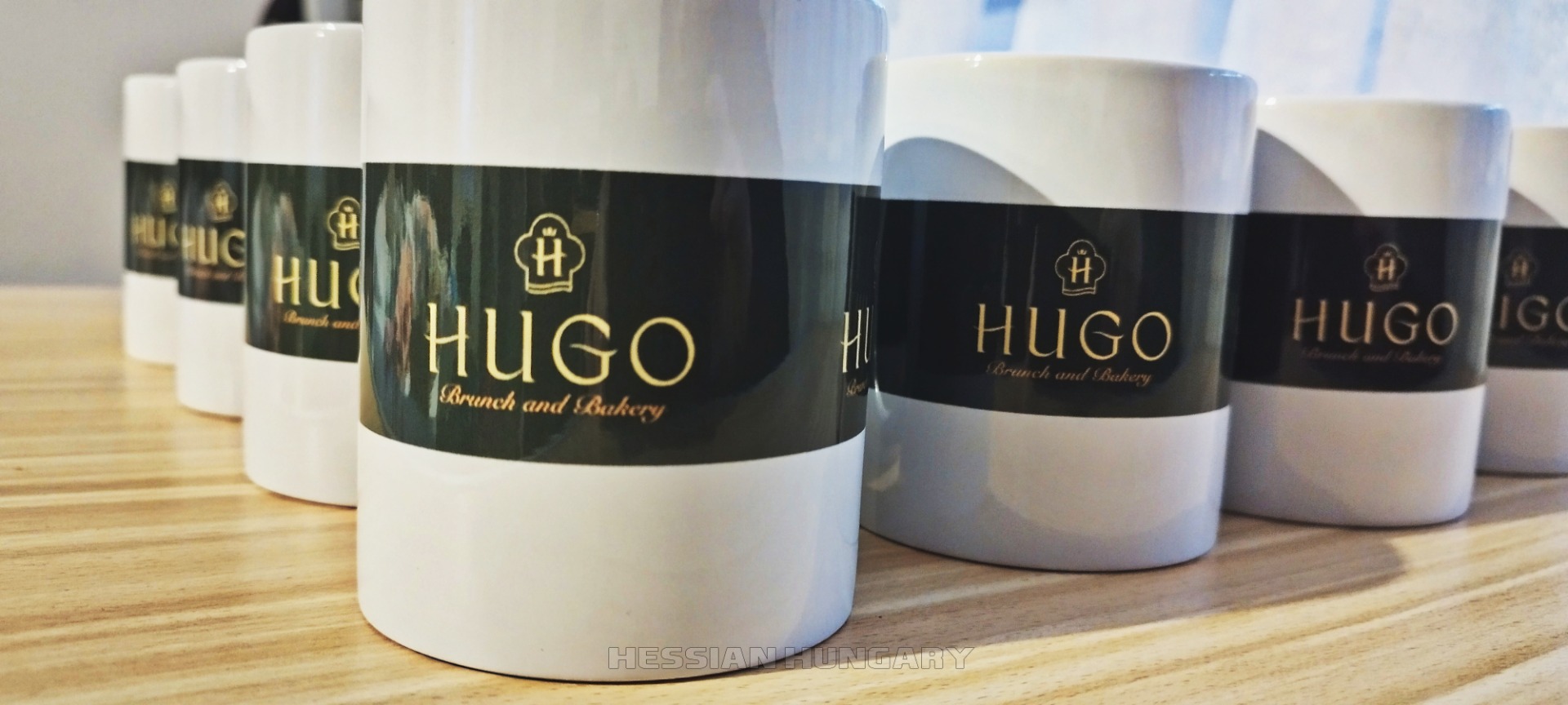 Egyedi céges logóval nyomtatott kerámia bögrék. Köszönjük a rendelést az egri Hugo's Brunch & Bakery-nek!