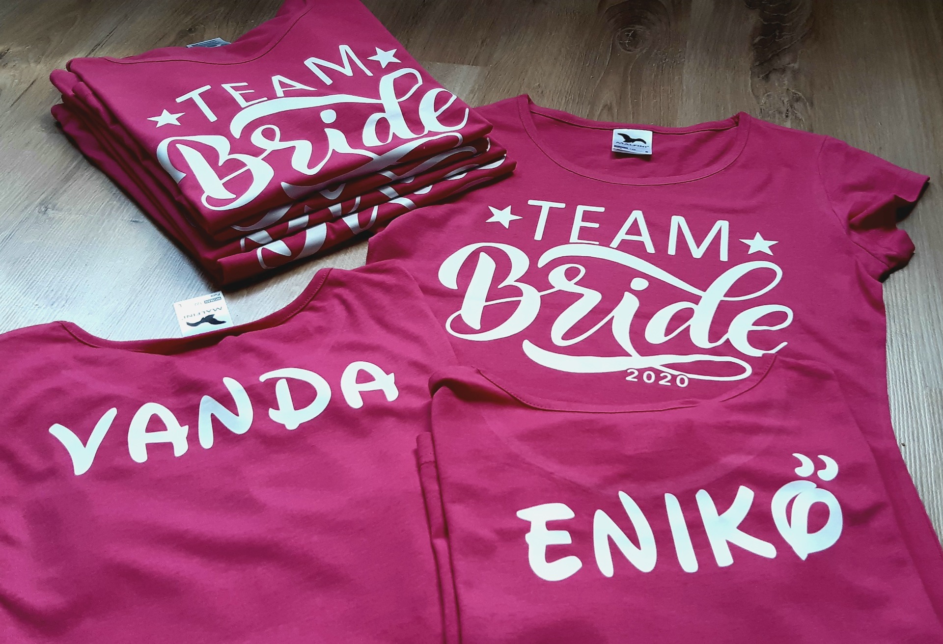 Lánybúcsúra rendelt pólók. A Megrendelő által küldött mintákkal, külön a menyasszony és külön annak kísérete számára. A pólók háta szintén külön, névre szólóan lett nyomtatva.